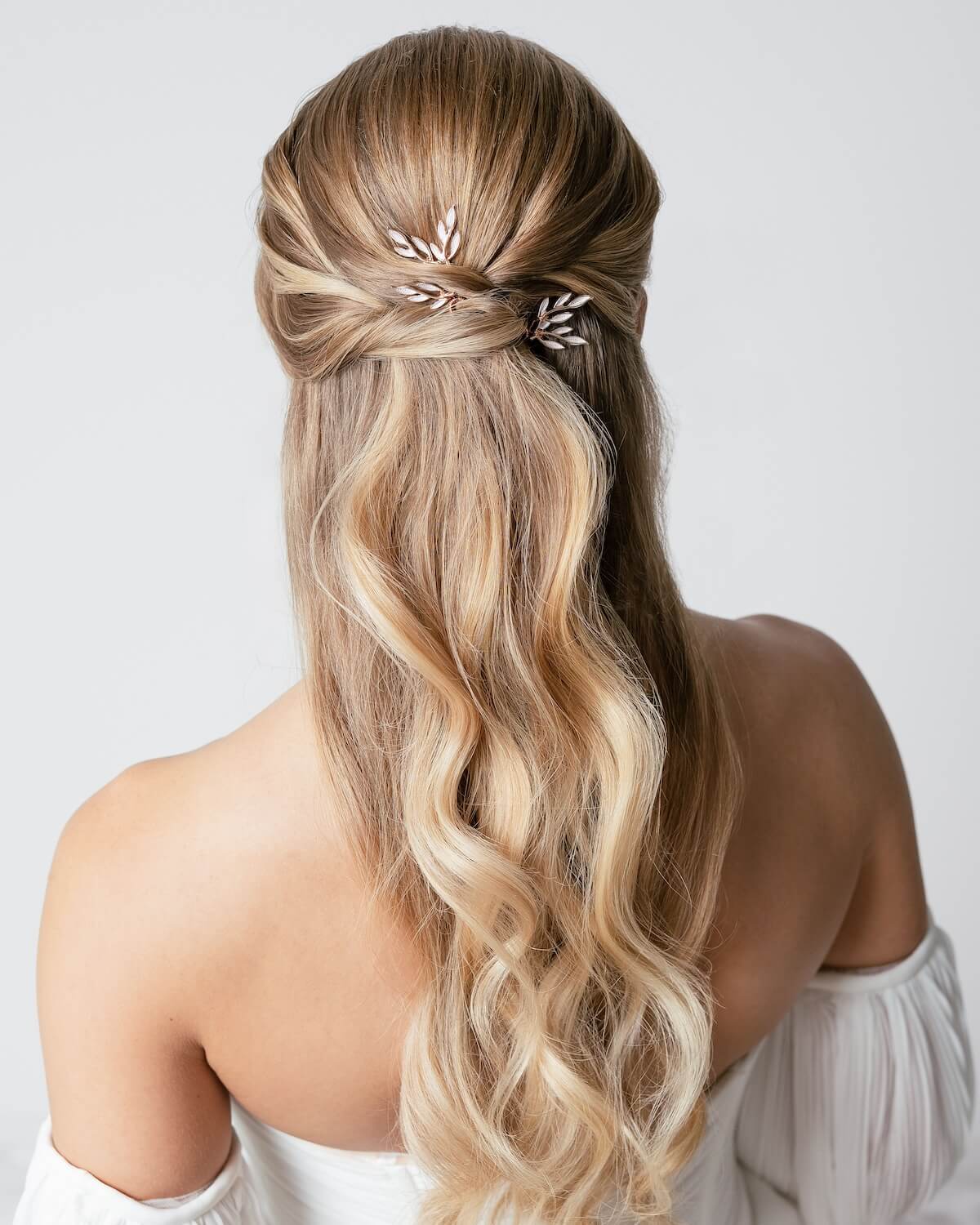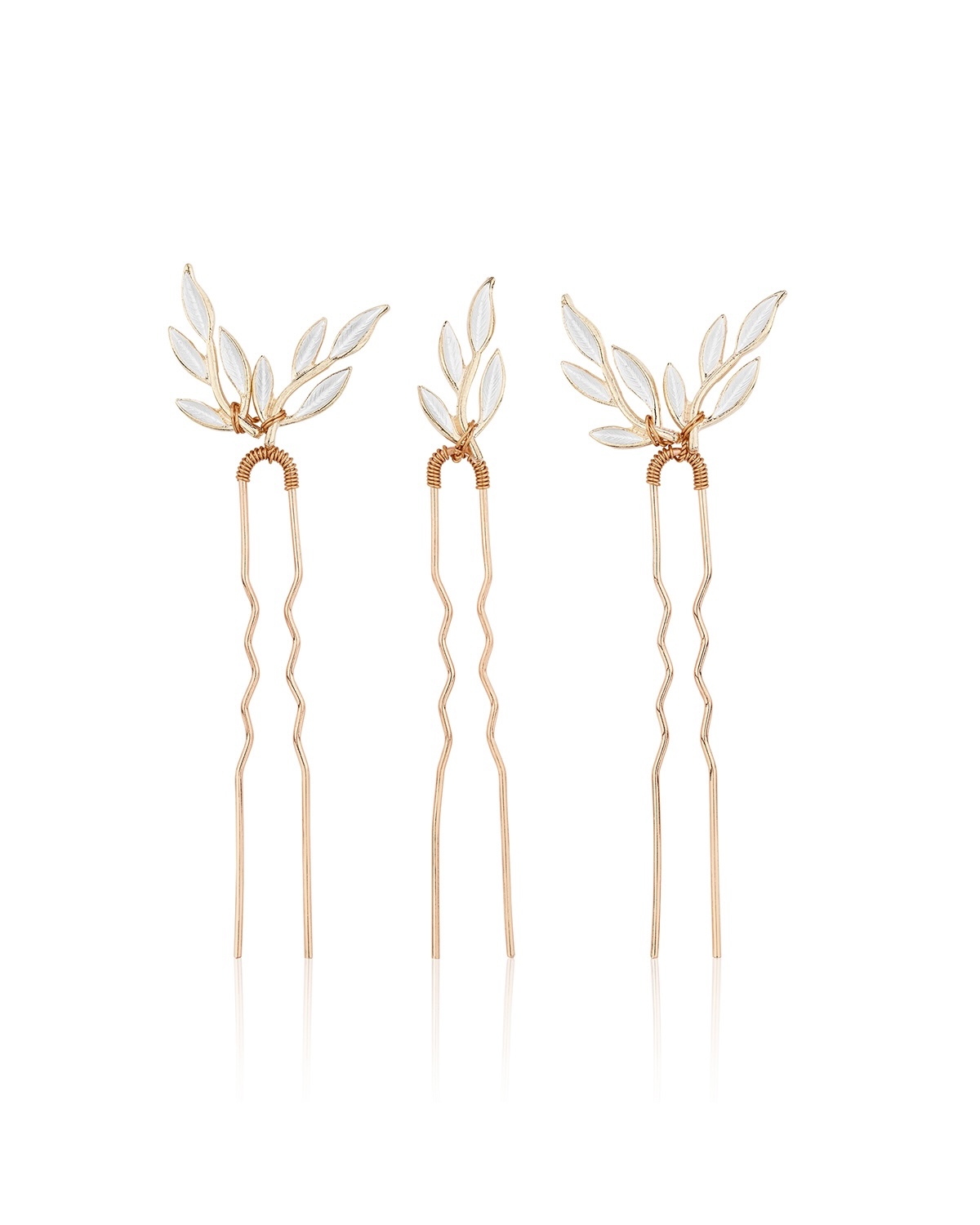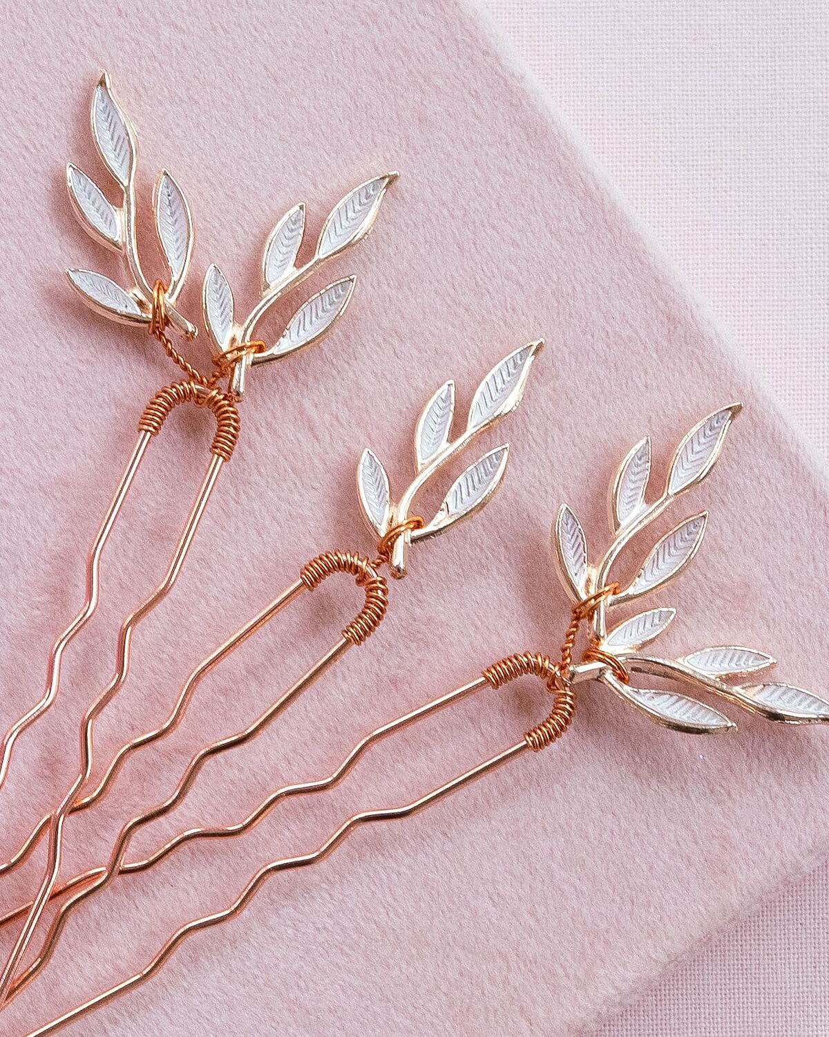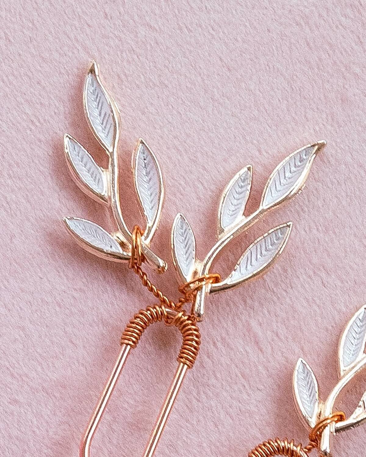 Unser Haarnadel-Set FIONA ist mit filigranen Blättern kreiert und lässt sich sowohl in halb offene wie hochgesteckte Brautfrisuren mühelos integrieren. Die Haaraccessoires passen perfekt zu Brautkleidern mit Blätterspitze und werden dein Styling wunderschön abrunden.
