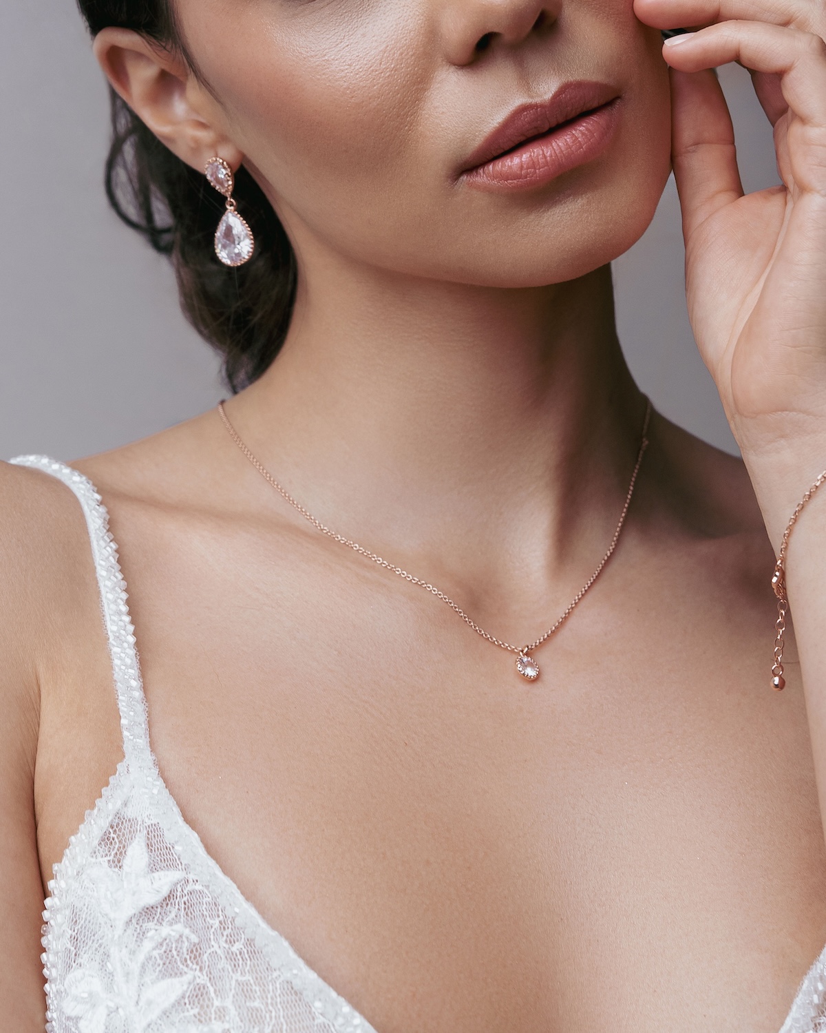 Unsere Zirkonia Halskette STELLA besteht aus 925er Sterling Silber und ist mit ihrem glitzernden Zirkonia-Stein eine tolle Wahl für Hochzeiten. Sie verleiht dem Brautlook einen Hauch Glamour, ohne aufdringlich zu wirken. Zirkonia ist zudem ein beliebtes Material, da es wie ein Diamant funkelt.