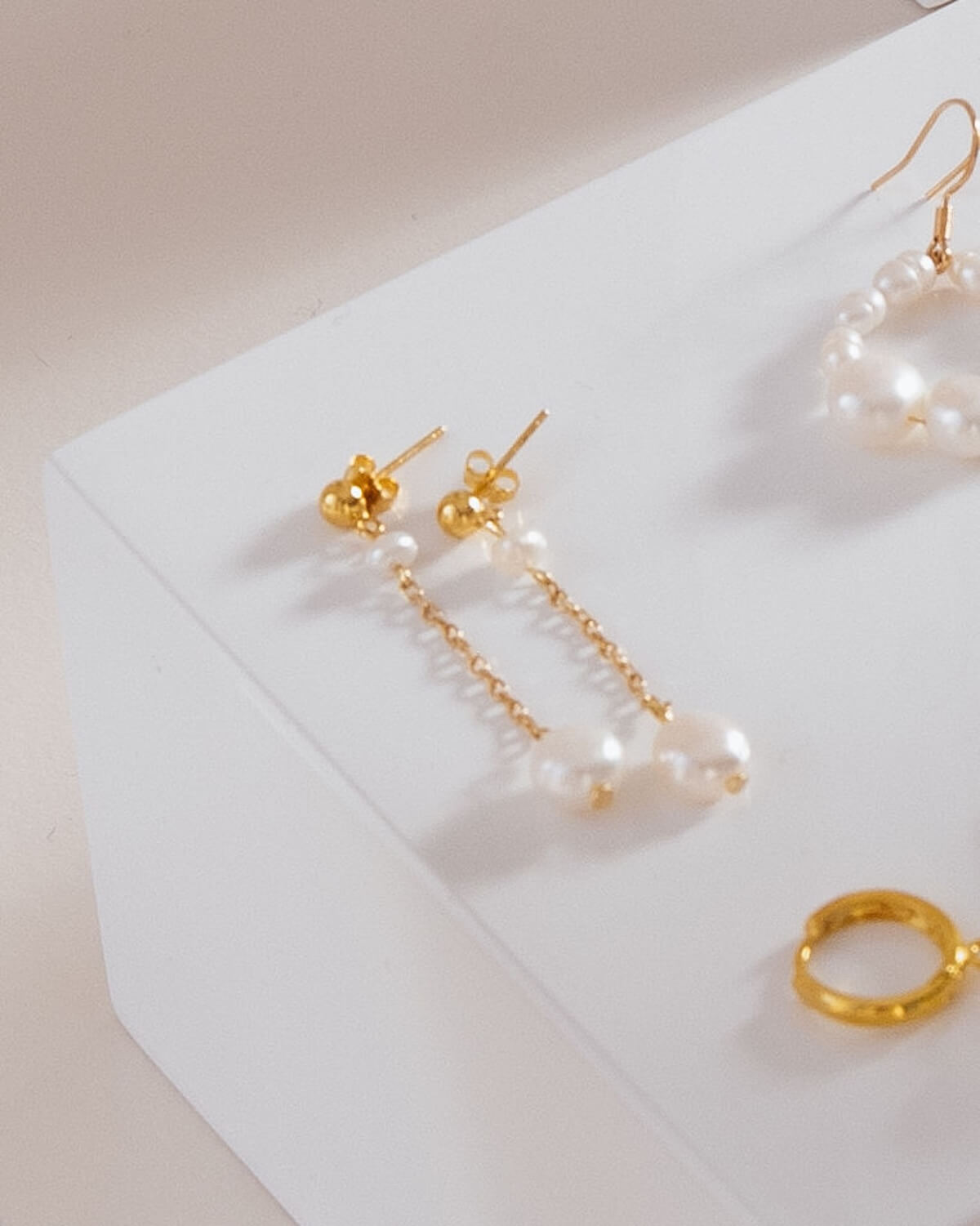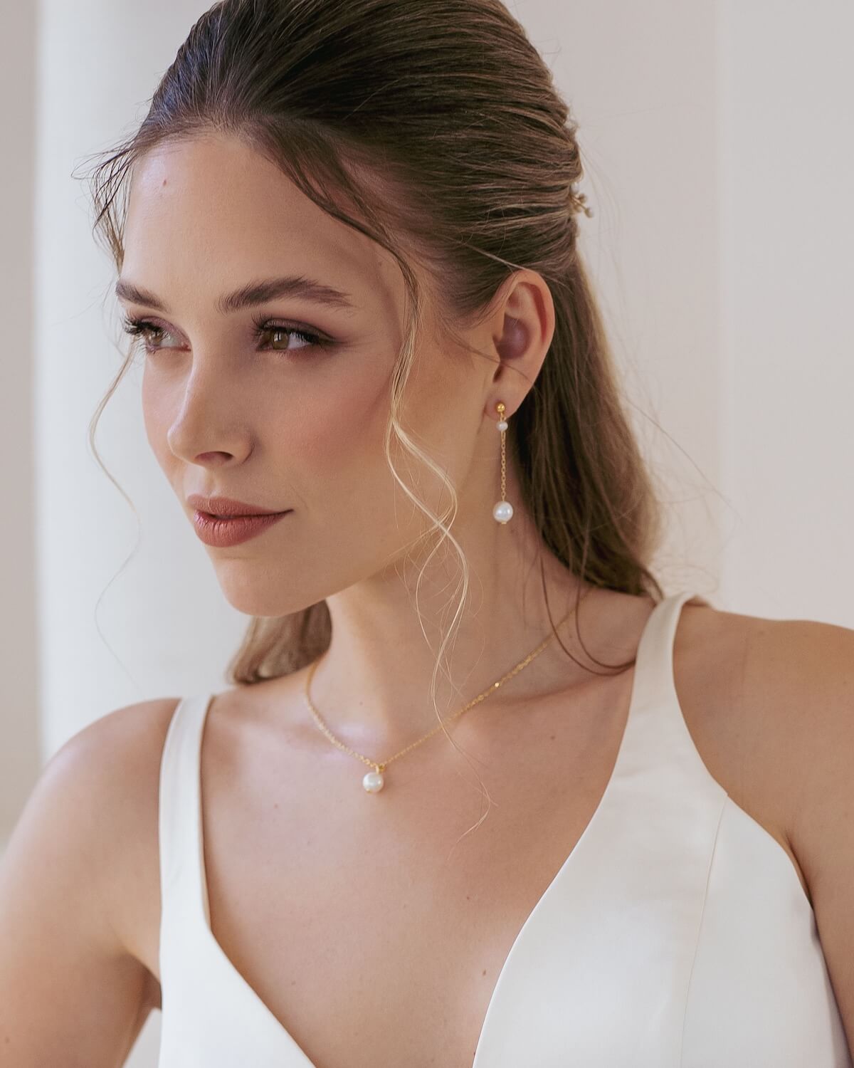 Gefertigt aus 925er Sterling Silber und mit schimmernden Süßwasserperlen verziert, vereinen unsere Perlen Ohrringe NORA zeitlose Schönheit mit modernem Ketten-Design. Sie lassen sich wundervoll zu den aktuellen Brautkleider kombinieren und unterstreichen stilvoll den Classy Bride-Look.