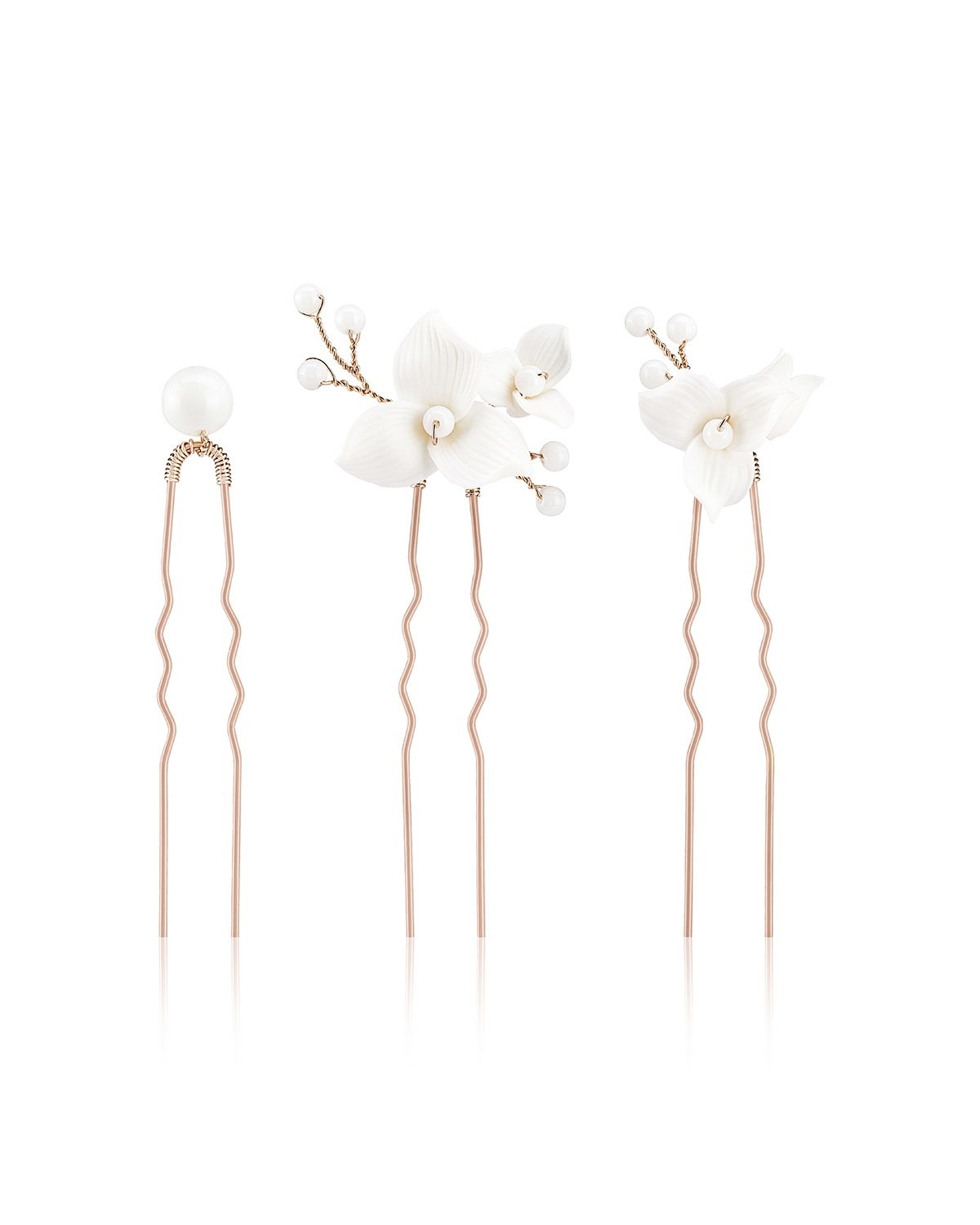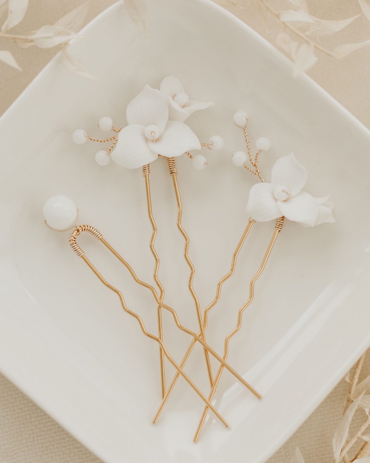 Entdecke unser bezauberndes Haarnadel-Set YVETTE, bestehend aus drei Haarnadeln, die mit zarten Keramikblüten und glänzenden Achatperlen verziert sind. Dieses Set ist ideal für romantische Brautfrisuren. Die filigranen Details und die harmonische Farbgebung machen die Nadeln zu einem perfekten Accessoire für den großen Tag.
