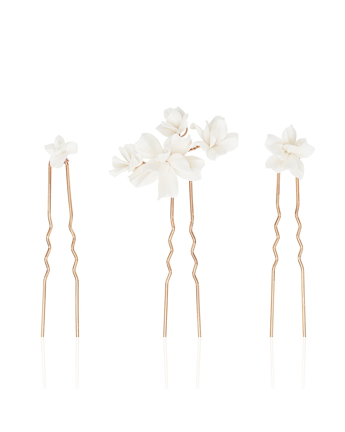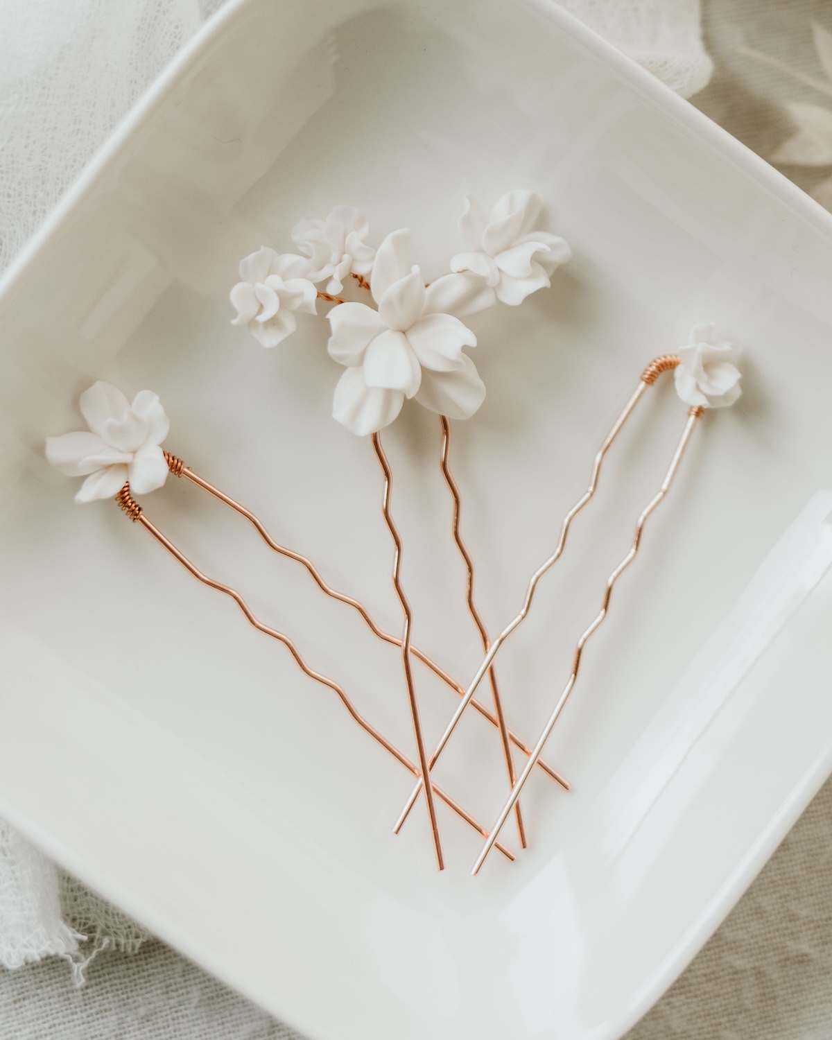 Verleihe deiner Brautfrisur einen Hauch von Eleganz mit unseren handgefertigten Haarnadeln mit Blumen VALERIA. Diese vielseitigen Nadeln lassen sich mühelos in verschieden Hochzeitsfrisuren integrieren und bieten unzählige Stylingmöglichkeiten für die Braut – ob im lockeren Dutt oder in halboffenen Haaren – die Blüten setzen wunderschöne Akzente.