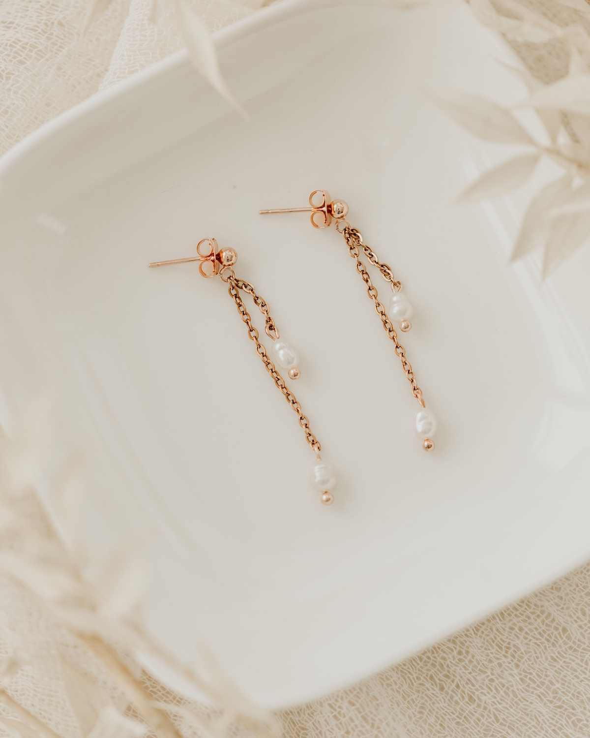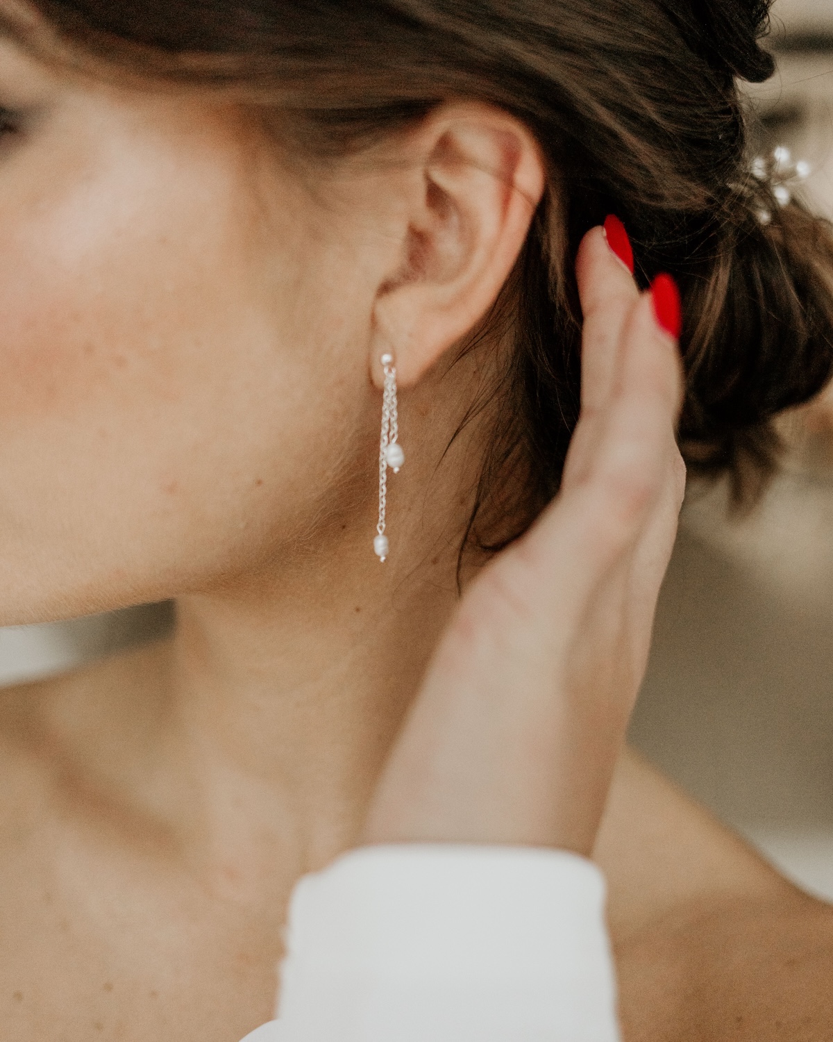 Unsere hochwertigen Perlen Ohrringe JULIE aus 925er Sterling Silber sind mit angesagten Ketten und echten Tiny Süßwasserperlen gestaltet. Die Ohrringe sind die perfekte Wahl für moderne Bräute, die ihrem Brautlook eine stilvolle Note verleihen möchten. Mit ihrem zeitlosen Design und der feinen Verarbeitung sind sie ideal für den großen Tag.