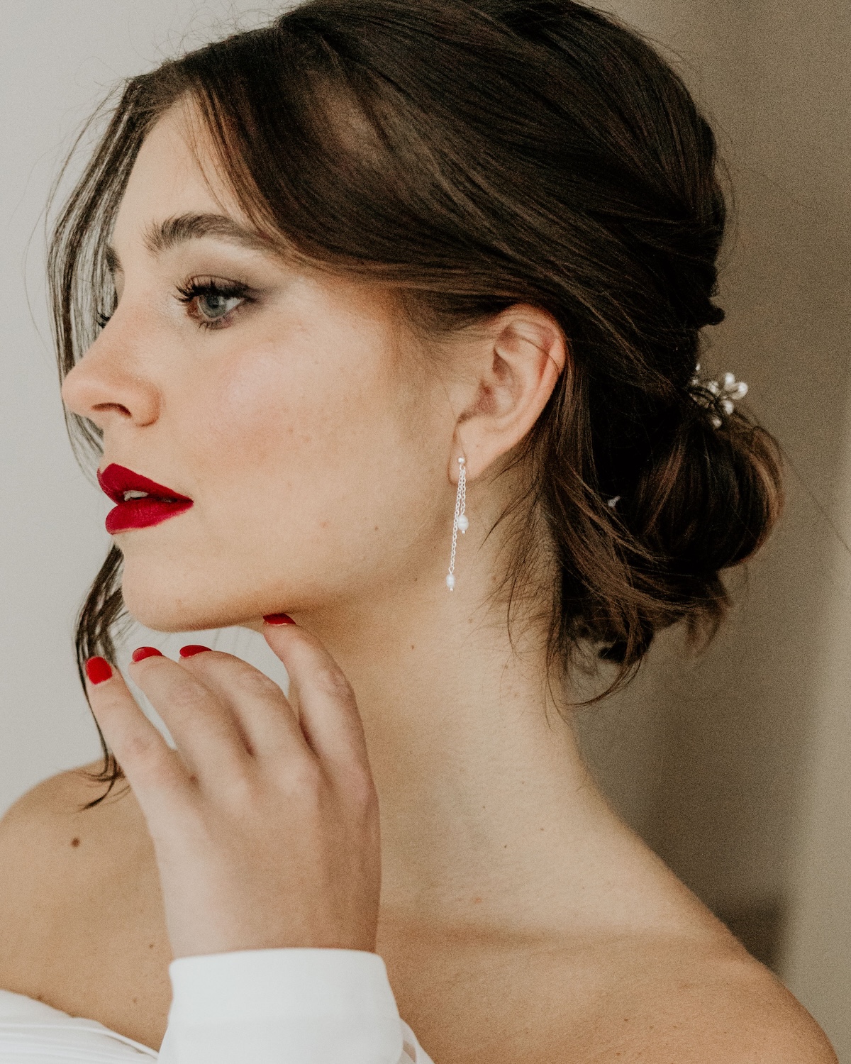 Aus den Gesprächen mit unseren Bräuten haben wir folgende Erkenntnis gewonnen: Bräute, die im Alltag nie Ohrschmuck tragen, fühlen sich mit dezenten Varianten am Wohlsten. Hier eignen sich dann schlichte Ohrstecker mit einer Perle oder einem Zirkonia-Stein am Besten. Auch dezente Ohrhänger, die nicht allzu lang sind, können in die engere Auswahl kommen. Wer sich traut und am Hochzeitstag mal ganz anders aussehen möchte, kann natürlich auch auffälligere Ohrringe wählen.