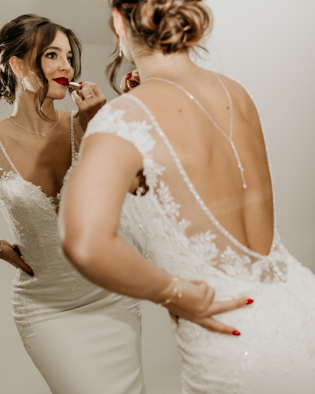 Unsere durchgängigen Rückenketten werden über Kopf angezogen. Daher empfehlen wir die Kette bereits vor dem Styling anzulegen, damit sie sich später nicht in der Brautfrisur verheddert. Unsere Rückenketten Einhänger kannst du einfach in den Karabiner deiner Halskette einhängen.