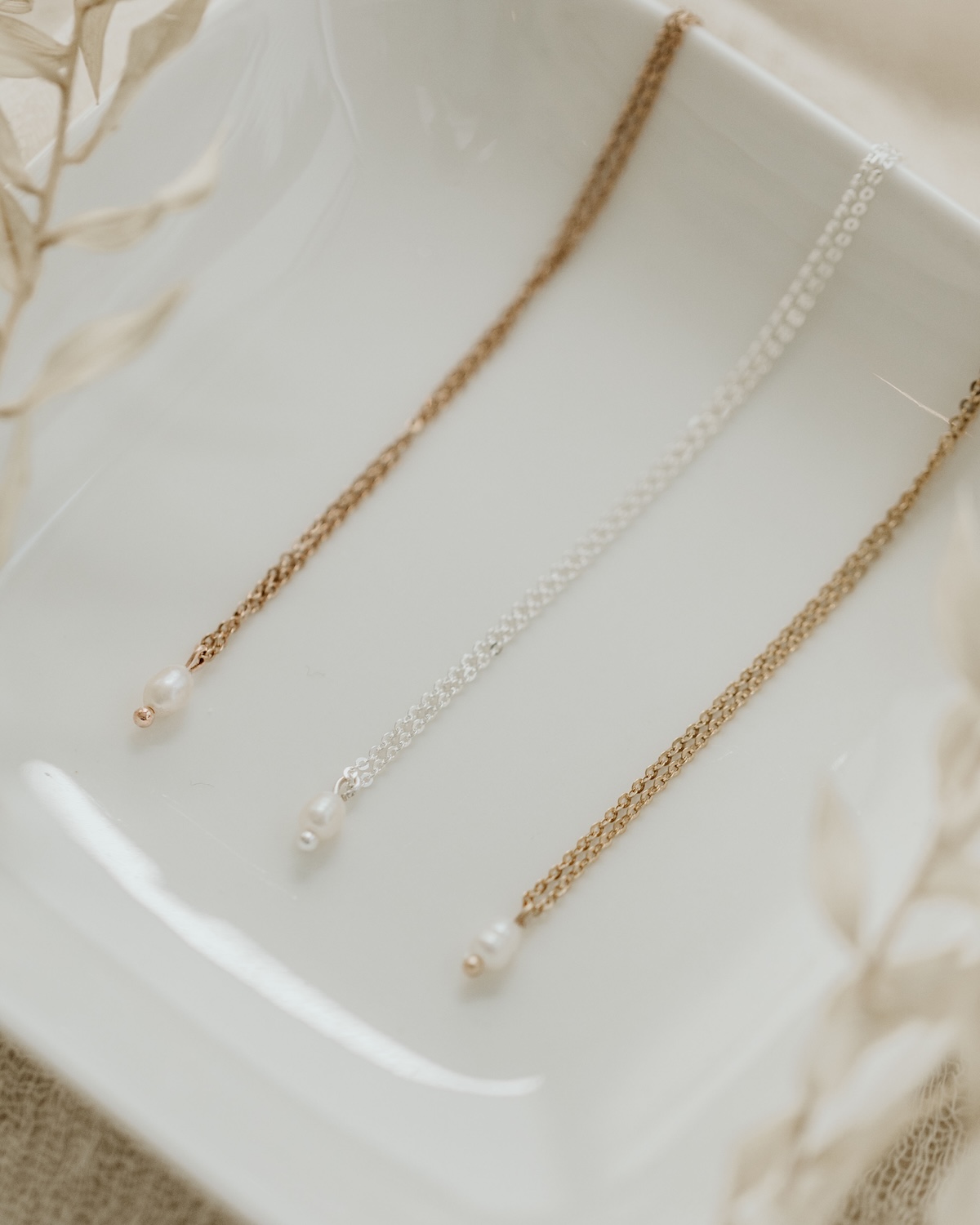 Hier präsentieren wir dir zeitlose Schmuckstücke, die sich wunderbar mit unserer Halskette mit kleiner Perle kombinieren lassen. Diese Accessoires sind die perfekte Wahl für einen eleganten Hochzeitslook. Wähle aus passenden Ohrringen und stilvollen Armbändern deine Favoriten aus, um einen harmonischen und unvergesslichen Brautlook zu kreieren. Lass dich von der Schönheit und Eleganz unserer Schmuckstücke mit echten Süwasserperlen verzaubern.