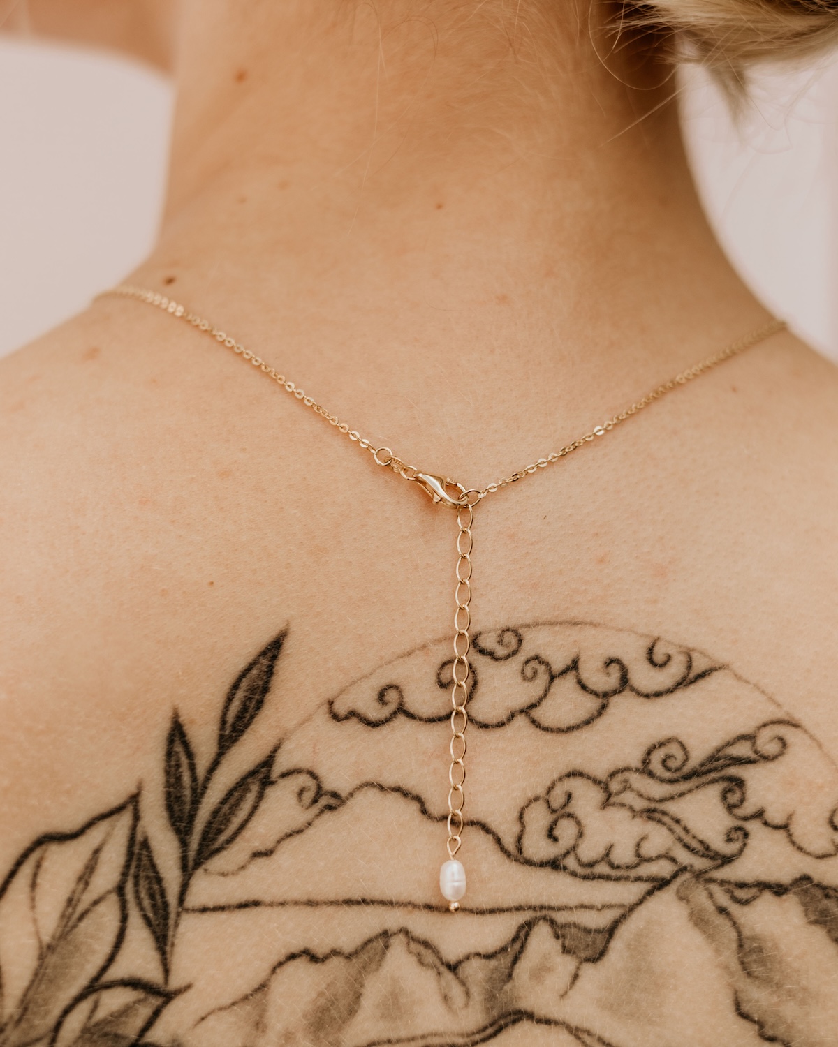 Unsere durchgängigen Rückenketten werden über Kopf angezogen. Daher empfehlen wir die Kette bereits vor dem Styling anzulegen, damit sie sich später nicht in der Brautfrisur verheddert. Unsere Rückenketten Einhänger kannst du einfach in den Karabiner deiner Halskette einhängen.